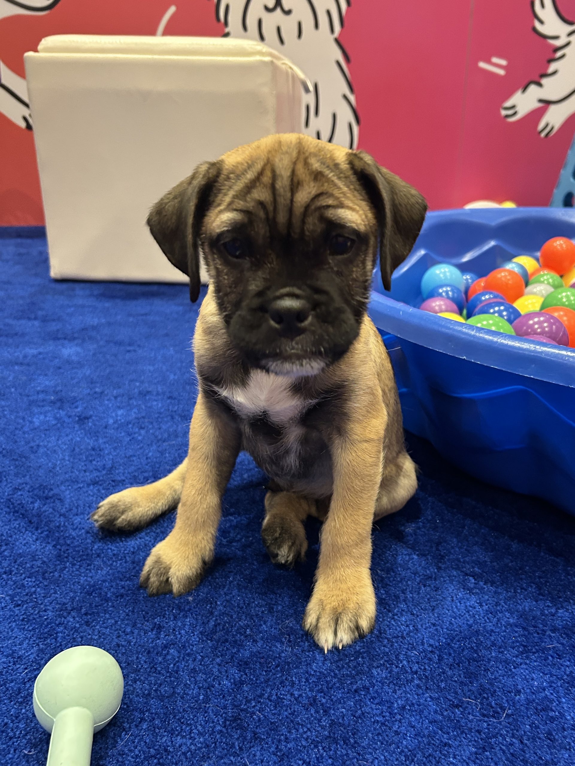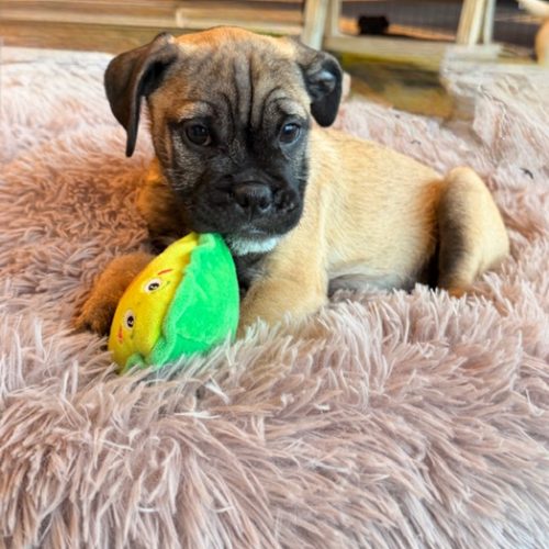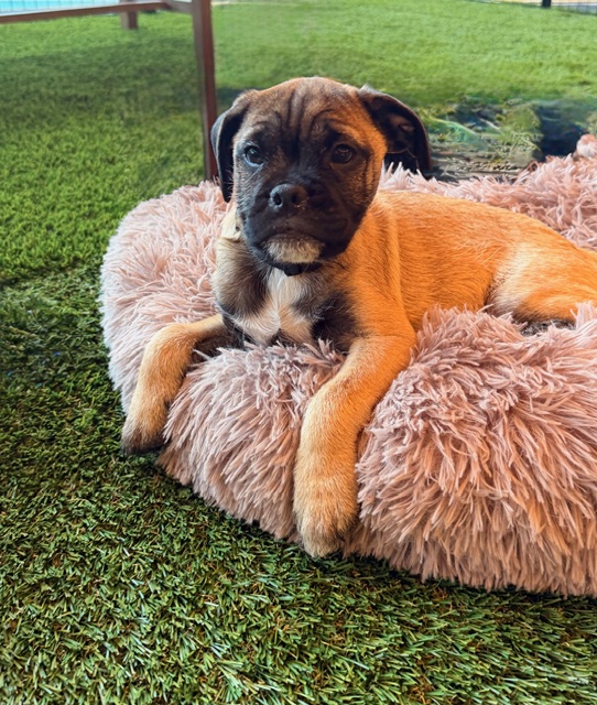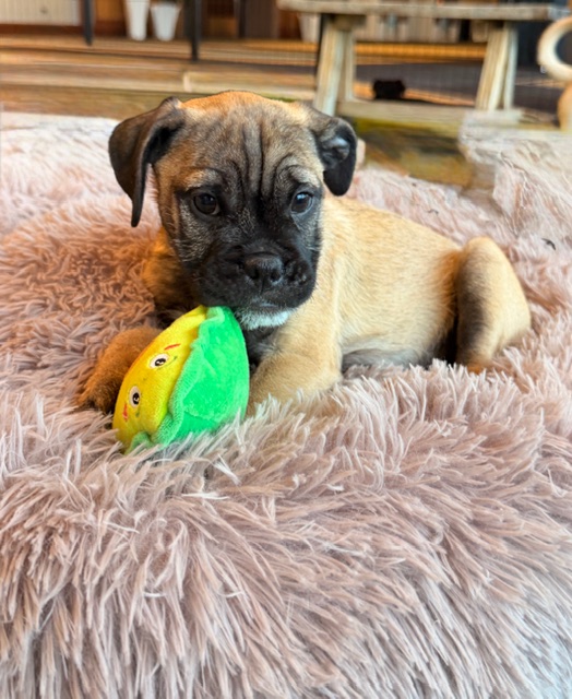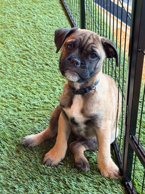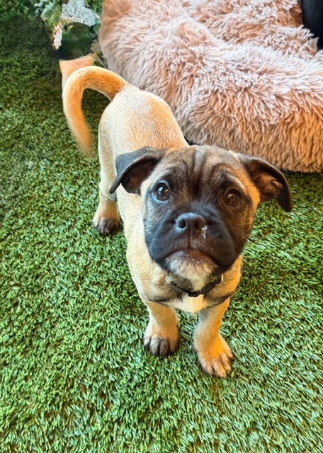 Spark is a bright, observant puppy with a gentle, inquisitive nature. While we originally thought he and his siblings were terrier mixes (mom is a total look-alike!), their squishy faces told another story — DNA shows 40% Bulldog, 20% Pug, plus a mix of other small breeds. Born December 16, 2025, Spark is expected to be 15–20 lbs as an adult.