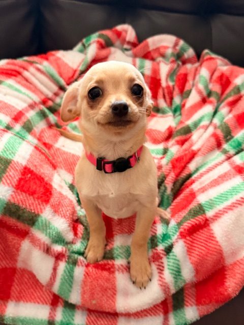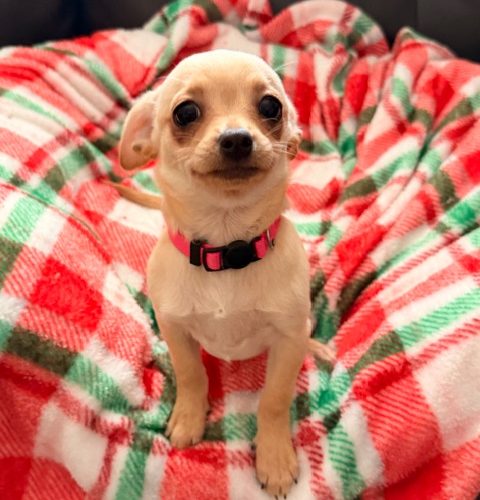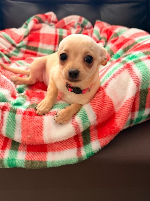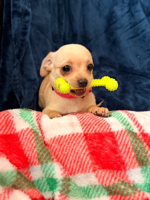 Ahtziri is the only girl in her litter of 5 but she has no trouble keeping up with the boys! This cutie is thought to be a Chihuahua/Terrier mix and she is full of puppy sass and fun! Ahtziri was born around the end of October and is expected to stay under 10 lbs when fully grown.