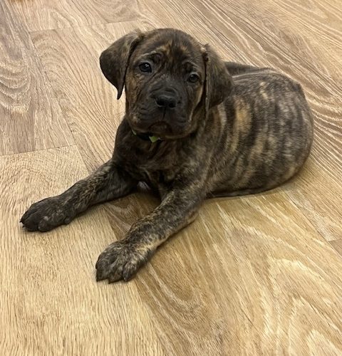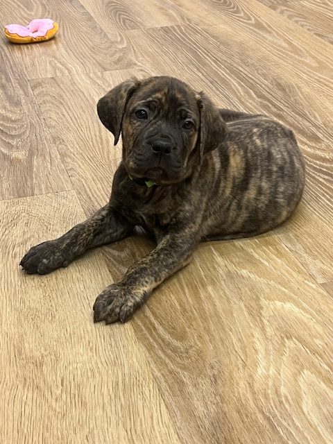 Corviana joined us after being left at the local shelter when she was just a few days old. We are told she and her siblings are Cane Corso but we did not do a DNA test to confirm - they are cute, dark brindle, chunky love muffins! Corviana loves to be held, she was bottle fed and raised in one of our foster homes where she received lots of love. She is having fun playing with toys and her siblings. We are guessing her adult weight to be at least 60 lbs. Corviana will need a home with the time and patience to train her to become a well mannered family member.