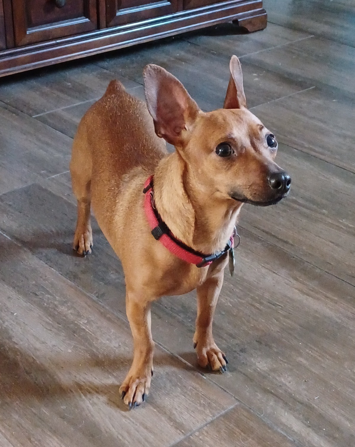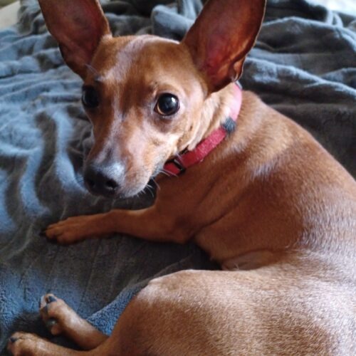 Arya is a typical Min Pin, lots of personality, playful, loyal and full of mischief! This cute girl is just under one year and loves to play with toys. She gets along with the other dogs in her foster home but does like to be in charge. When Arya isn't playing, she is snuggled under a blanket, recharging. She weighs 9 lbs and is ready to go home today!