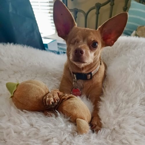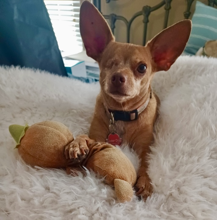 Bambi was adopted from us 9 years ago and lost her home when her family lost theirs. She re-joined us with her "sister" Lola, they've been together almost their entire lives and would love to find a home together but they also do just fine separately and have made friends with the other dogs in their foster home. Bambi is now 10 years old and easy, preferring to sleep most of the time. She lost one eye when she was a puppy but it doesn't slow her down, she is a loving lap dog who will be happy in a quiet home with a soft bed and cozy blanket. Bambi weighs 12 lbs but could benefit from losing a couple and regaining her youthful figure.