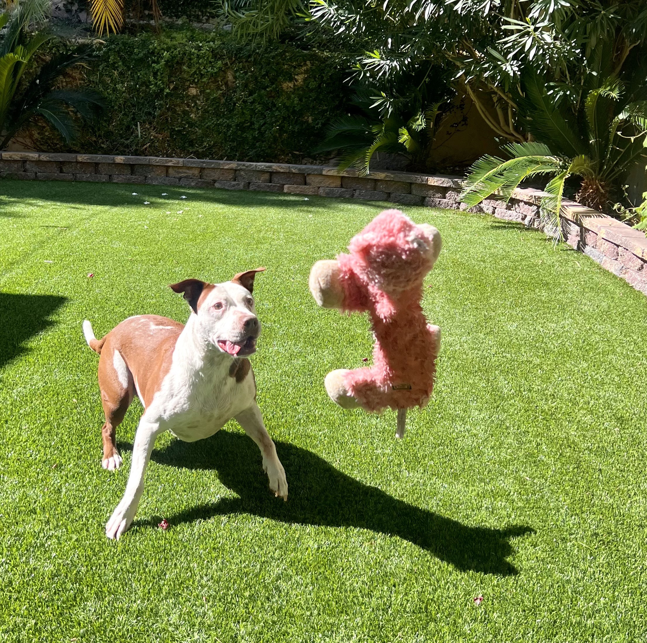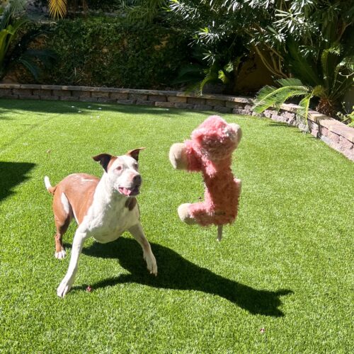 The first four years we owned her my husband was alive and paid a lot of attention to her and she did very well with visitors to the house, etc. My husband passed away two years ago. No one comes to the house now and she’s very scared and can be protective of me when someone new comes in the house. But she does do well at the free roaming daycare. She’s very happy go lucky and is very healthy. She has never destroyed anything and left alone and has never had an accident in the house. I leave her alone a lot and she free rooms in an out through the dog door and does very well. She’s very independent no anxiety issues.