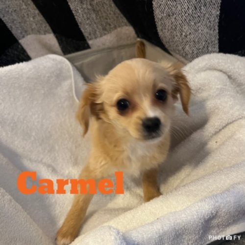 Carmel is as sweet as she can be, enjoying cuddle time, play time and all things puppy! She is getting well socialized in her foster home, being raised around young kids and other dogs. Carmel was born at the end of October and is expected to be in the 10-12 lb range when fully grown.