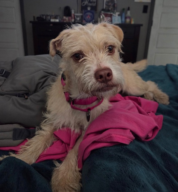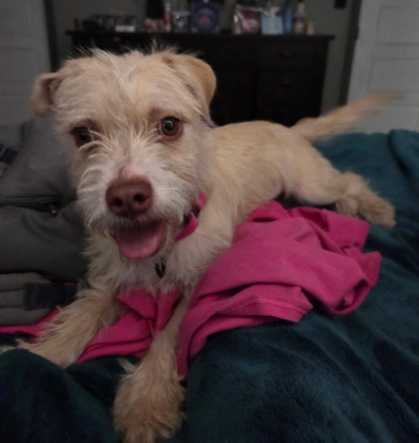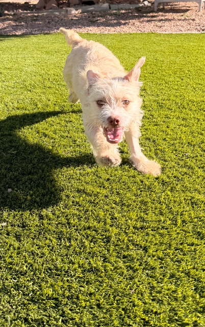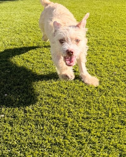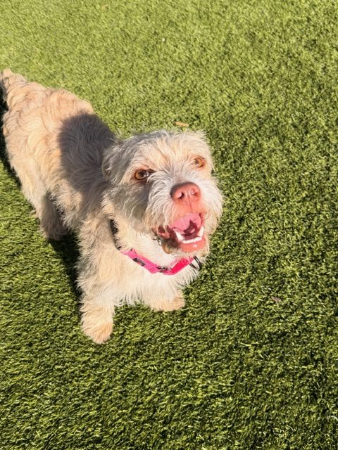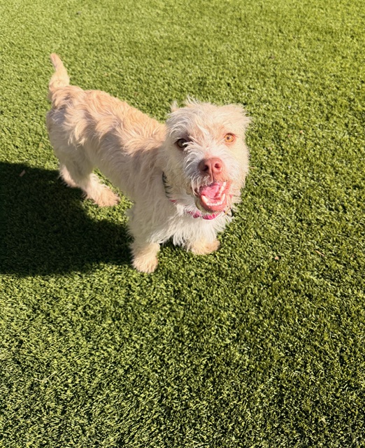 Cream Puff is a 7 month old girl who loves life and everyone in it! This happy girl thinks everyone is her friend; she loves to run and explore and she will do best in a home with another fun dog or some kids to keep her busy. Puff weighs 18 lbs currently and has a little more growing to do, we expect her to stay at 25 lbs or less.