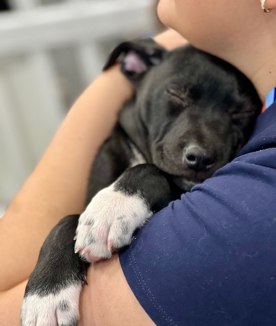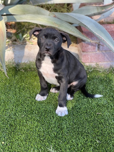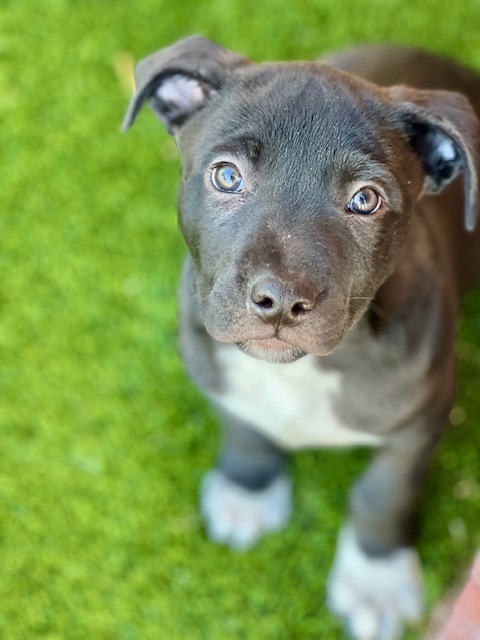Dash came to us in early December without a mom and he instantly settled into his foster home where he has been getting lots of cuddles - and getting into lots of mischief! He is a solid boy who we expect to be in the 60-70 lb range when fully grown. Dash appears to be a pittie mix with the best of a few other breeds mixed in.