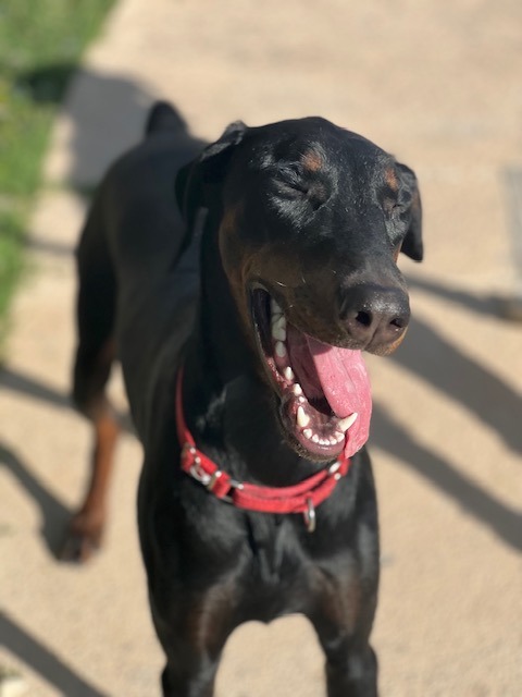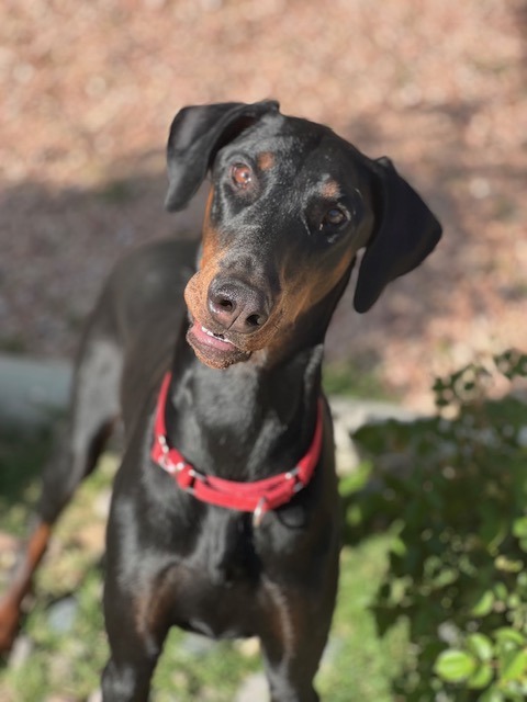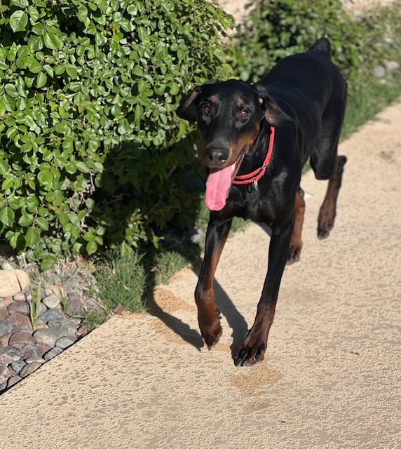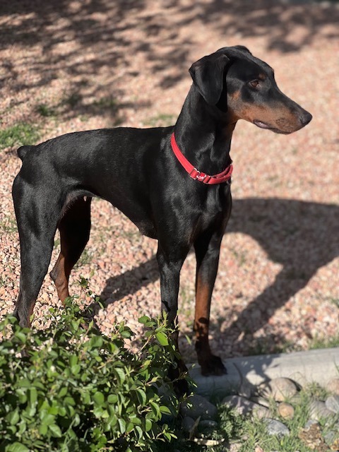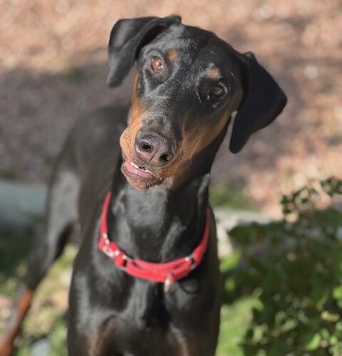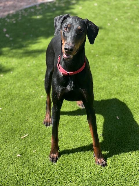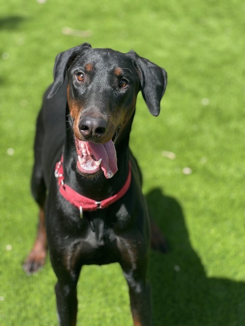 Daphne is the perfect combination of beauty and personality! This stunning Dobie gets along well with dogs of all sizes and is good with people of all ages. She does the typical Dobie lean into people to encourage them to pet and love on her. Daphne likes to play with other dogs, will chase a ball - and sometimes bring it back! She is kennel trained and house trained although she will bark at first when left alone. She is estimated to be between 1-2 years old and weighs approximately 65 lbs.