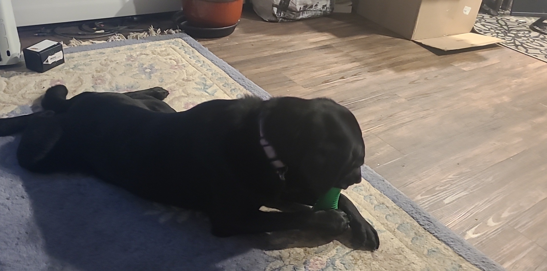 High energy black lab that is friendly to all, although does bark and lunge at other dogs out of excitement