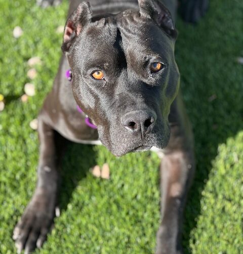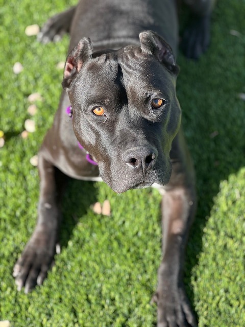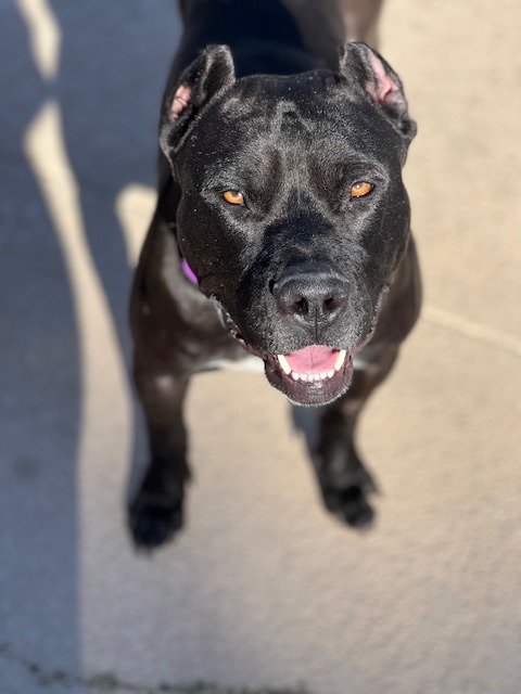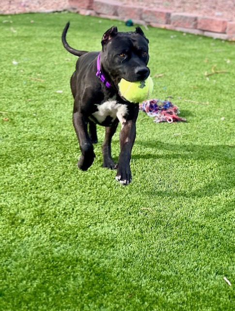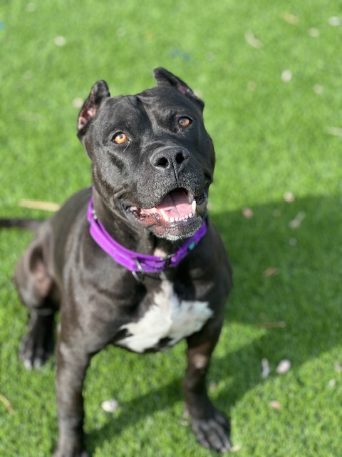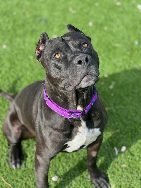 Dozer is an approximately 1 year old, 45 lb handsome man who full of charm! He is instantly friendly with people and loves to play with other dogs. Dozer is a strong dog and doesn't always understand his strength so small dogs or young kids may not be the best fit for him. He will benefit from professional training as he does pull on a leash and does jump on people in excitement. Dozer knows the sit command and he is kennel trained. He is eager to find a loving home who can provide him with consistency - and treats!