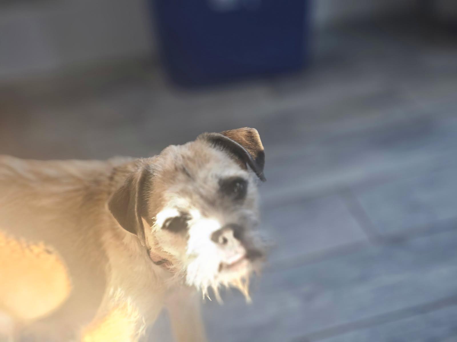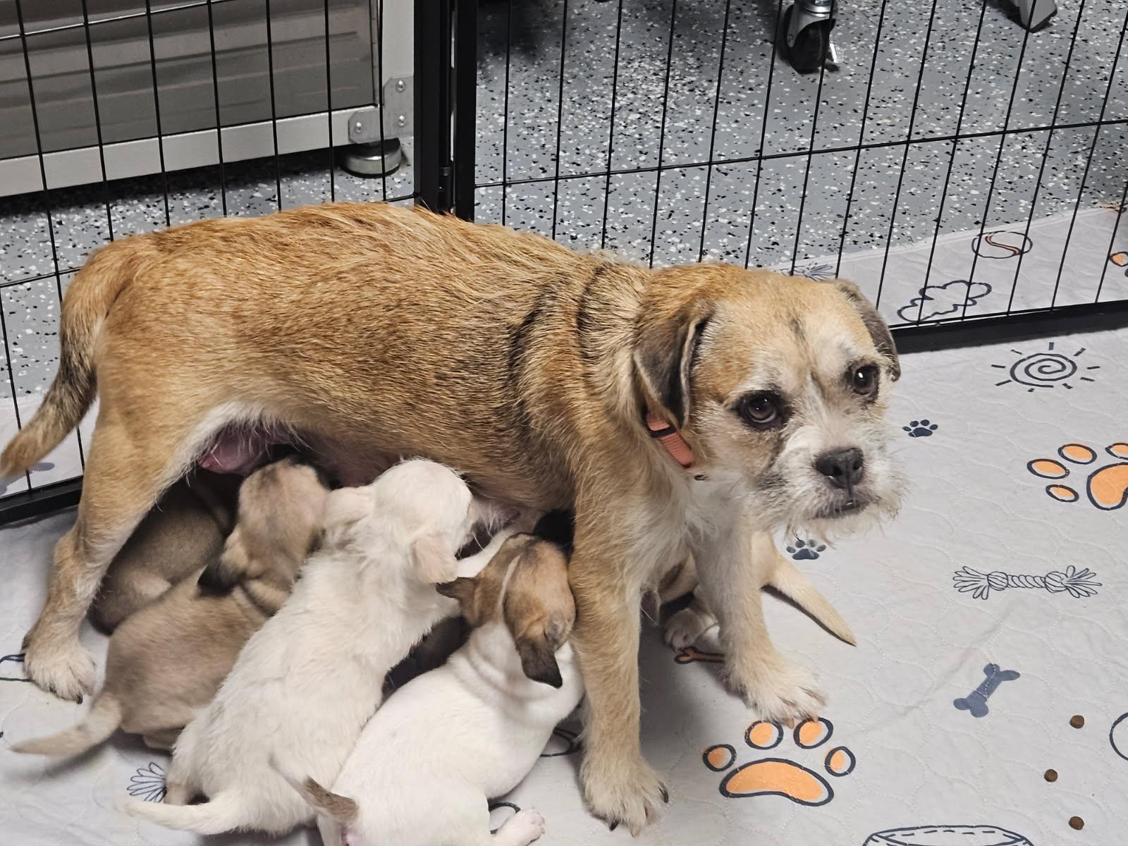 Honey is a Terrier Border mix and is about 2 years old who was found huddled under an underpass. Two weeks later she became a gentle and attentive mama.