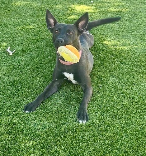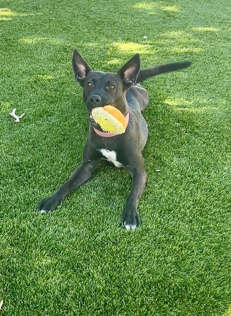 Jenny came to us from our local shelter where she had just given birth. We moved her and her puppies into one of our foster homes so she could relax and raise her family in peace. Jenny is shy in new situations and with new people but once she warms up, she is the sweetest, affectionate girl who loves to give hugs! She loves to play with a friendly dog in her size range but is also content to throw toys in the air all by herself! Jenny is in training to grow her confidence; she is approximately 2  1/2 years old and 40 lbs.