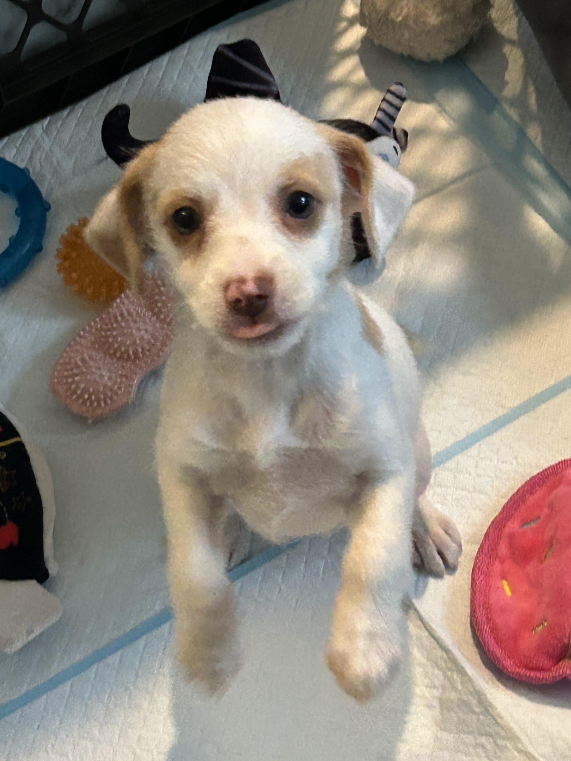 Julia is a ten week old terrier mix who came to us with her six siblings. She is a sweet girl who loves to playing with toys and gets excited to see people as shown by her happy tail.