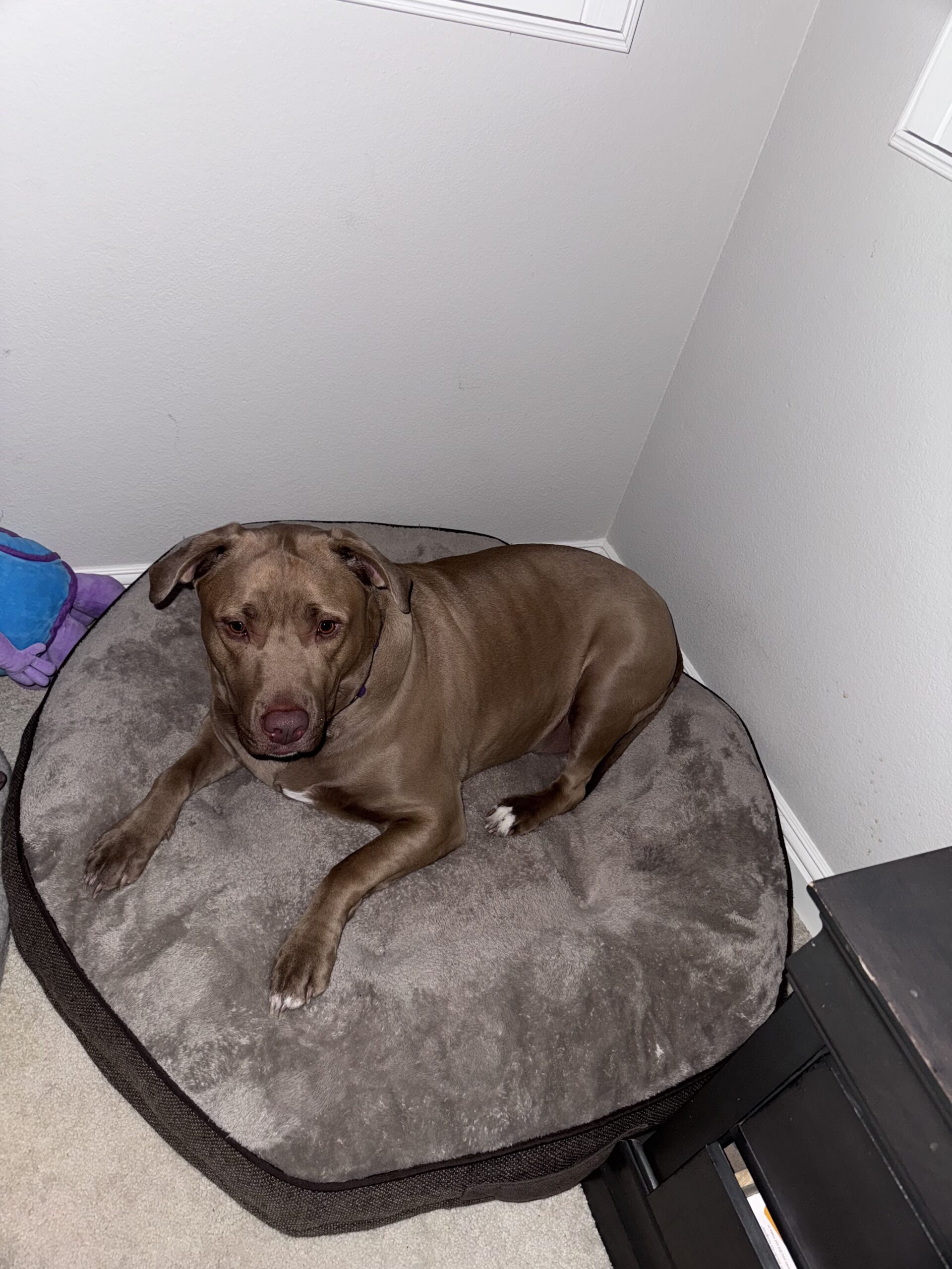 I have had her since she was born. I have her mother and brother, her father passed recently. She is the youngest of three. She is a great guard dog, observant, always following me. Definitely does not miss a meal, just need a calmer environment than what I can offer.