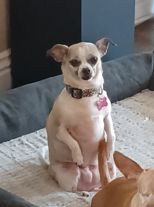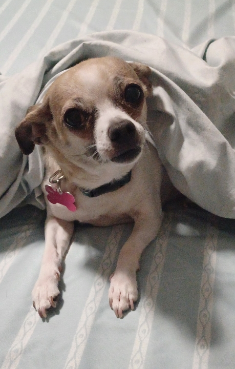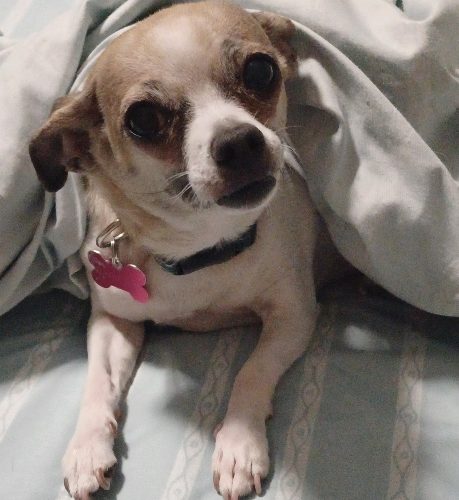 Lola is a shy, sweet girl who loves to sleep under the covers. She prefers women to men, but she will warm up to both. Lola is 9-10 years old and has had a recent dental cleaning so she can give fresh breath kisses once she loves you. Lola weighs 10 lbs and would benefit from losing a couple of pounds. She will be best suited to a quiet home who is looking for a lap dog.