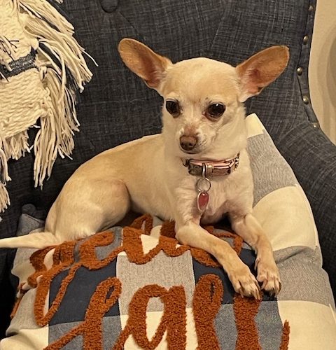 Lulu is a couch potato in need of a new couch! Her family has grown while she's been with them and with the latest addition of a large breed puppy, she is no longer getting the pampered lifestyle that she deserves. Lulu likes to cuddle, she has a small playful streak and is doing well with the other small dogs in her foster home. She is a petite 6-7 lbs and is 7-8 years old.