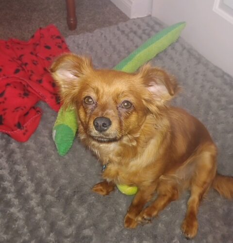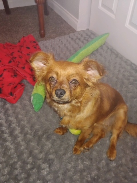 Maggie is living large in her foster home, surrounded by lots of toys! This playful girl enjoys walks around the neighborhood and tries to get the other dogs in her foster home to play but they are not impressed with her energy so she amuses herself with all of her toys. Maggie is approximately 1 year old and 15 lbs. She is a friendly girl who is kennel trained and has done well on her potty training.