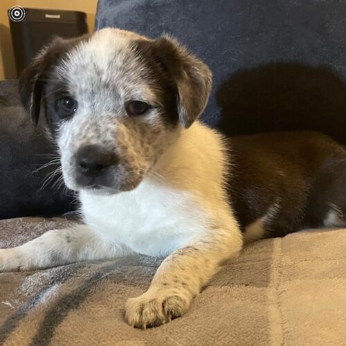 Manny joined us as a bottle baby after his mom Kenzi didn't have enough milk to feed him. He has been raised in a foster home and is well socialized thanks to their busy household consisting of kids, cats and other dogs! Manny is a true mixed breed, appearing to have some cattle dog due to his speckles, but he likely has many other breeds mixed in there as well. We are guessing his adult size to be 60 lbs.