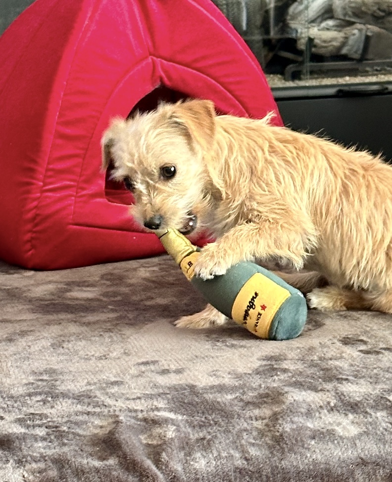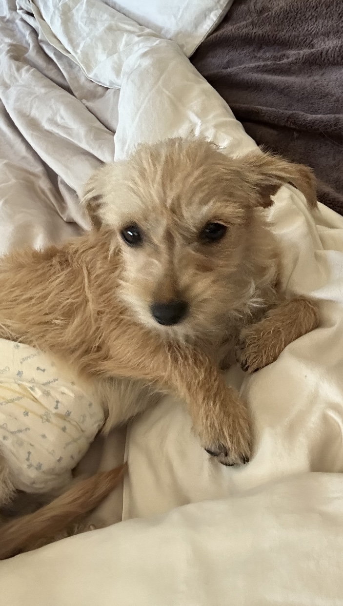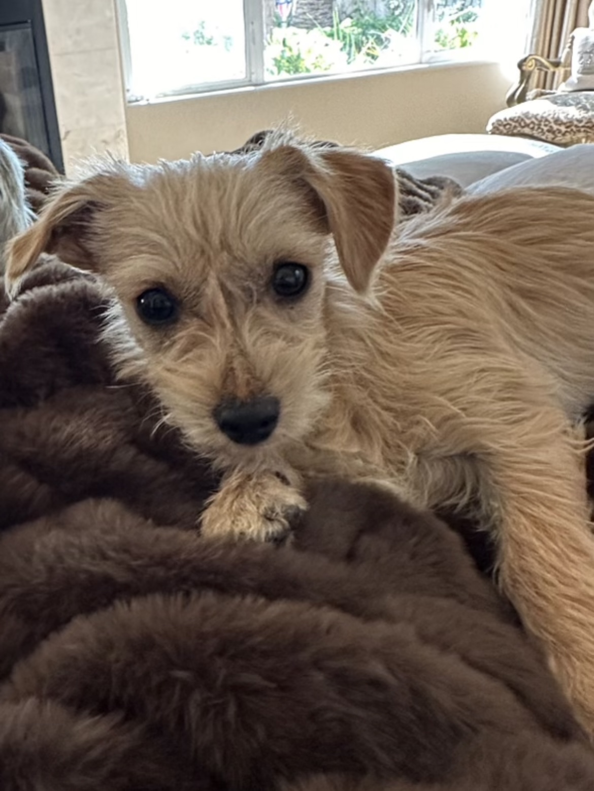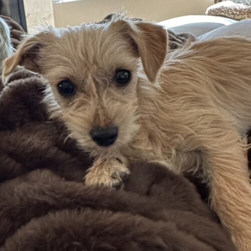 Manny is a sweet 8 month old boy who has spent his life living outside prior to joining us, as a result, he is a bit shyer than most puppies his age. He is adjusting well to life in his foster home and snuggles into the plush blankets on his foster's bed every chance that he can! Manny is also learning about how much fun toys are, chewing is a favorite puppy activity. We were told that he is a Poodle/Chihuahua mix - but he sure looks like a scruffy terrier! Manny would be best with another friendly dog in his forever home but he is open to a patient new family who will help build his confidence. He is currently 6 lbs and is expected to stay under 10 lbs when fully grown.