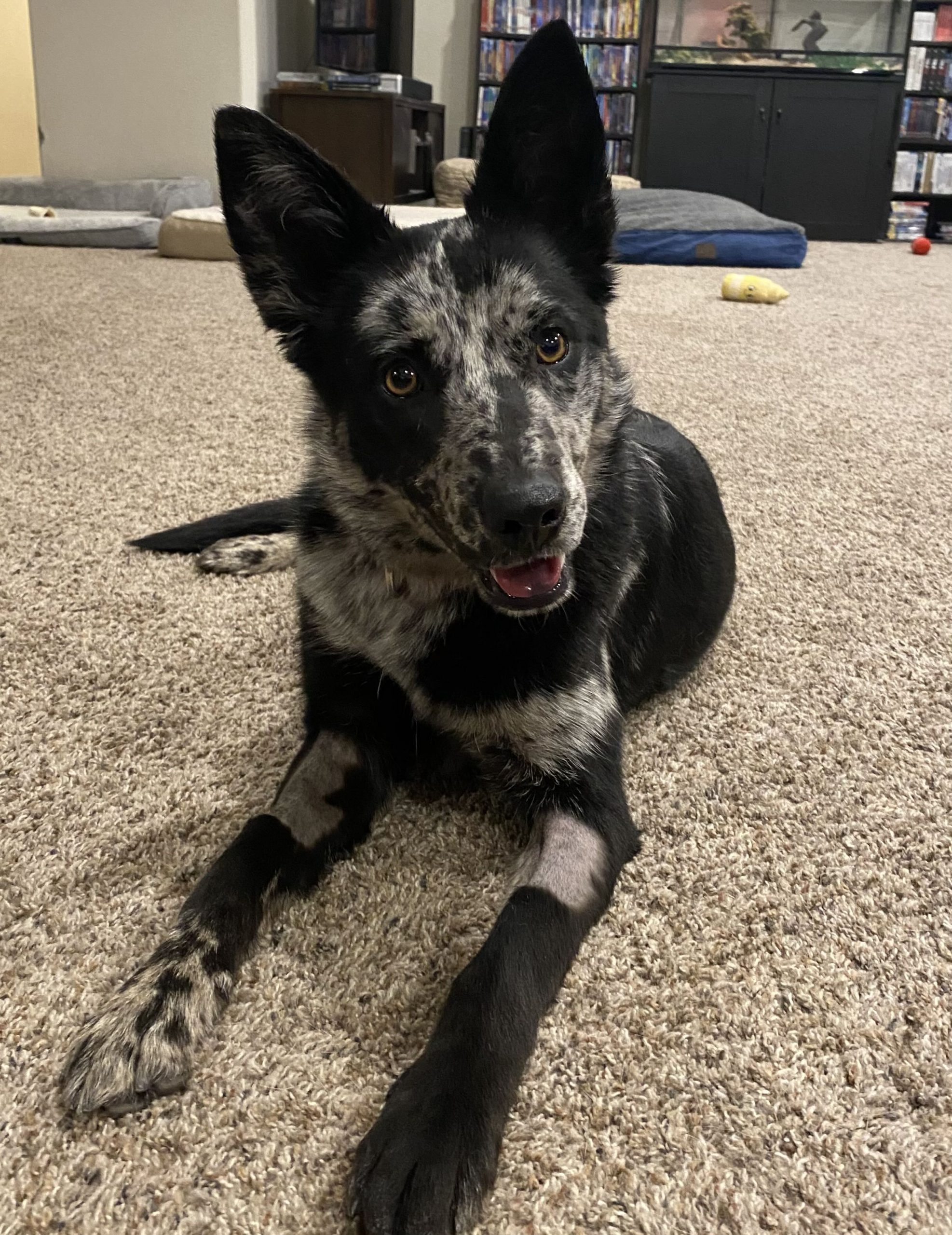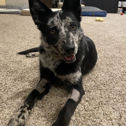 Mavis is around a year old, approximately 35lbs cattle dog mix with a heart of gold! She loves cuddles and wants to snuggle in her persons lap. She is great with other dogs and became instant besties with the two other dogs in her foster home. This girl is a FAST learner. She learned the doggy door within the first two days and hasn't had an accident in the house since. Though she will back up when approached, she's more than happy to come when called. She also walks like a dream on a leash making her the perfect hiking buddy. She can't wait to find her perfect person!