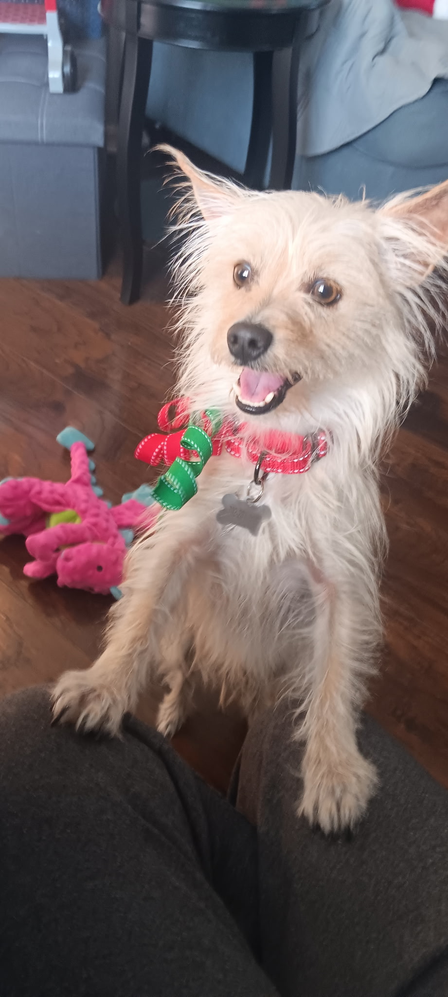 Milo came to us from a family that is moving out of the country; he is shy with new people but once he warms up and feels safe, he is a sweet boy who wants to be loved. He is doing well with the other dogs in his foster home and is learning how to walk on a leash. He grew up around kids and does have a playful side once he's comfortable. Milo lived his life in the yard and occasionally home but did not go on walks or ever leave his house so he will need a patient home to continue his confidence building in the big, scary world. Milo is 2-3 years old and weighs 12 lbs.