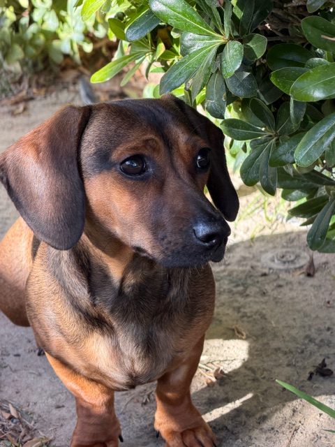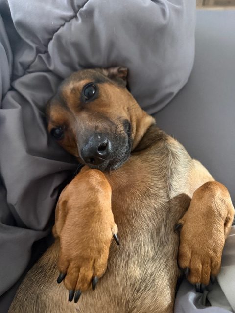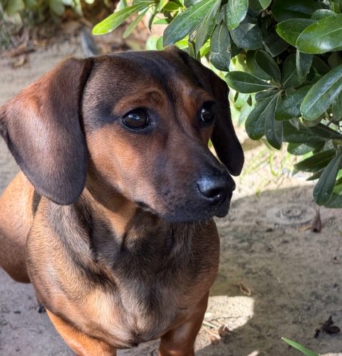 Mini came to us from someone who had too many dogs. She has been loved and it shows, cuddling is her favorite pastime. She had never left the home she had been born in so the world is new and a bit scary. Mini is not a fan of walks yet, although she does enjoy sunbathing in the yard. She will thrive in a home with the time and patience to help her confidence grow. Mini was born on June 30th and currently weighs 16 lbs. Her mom is a standard Dachshund while Dad is a Dachshund/Min Pin.