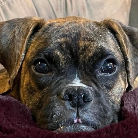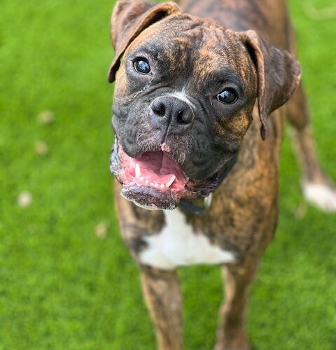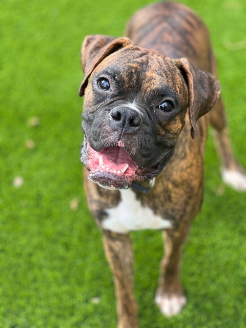 Rocky is a happy one year old Boxer who loves to make new friends - both people and other dogs! He lived with cats in his previous home and would chase them if they ran, though he never tried to hurt them. Rocky is house trained and kennel trained; he knows sit and will excel in further training. Rocky enjoys wrestling with other dogs, chasing tennis balls and cuddling on the couch. He weighs 48 lbs.