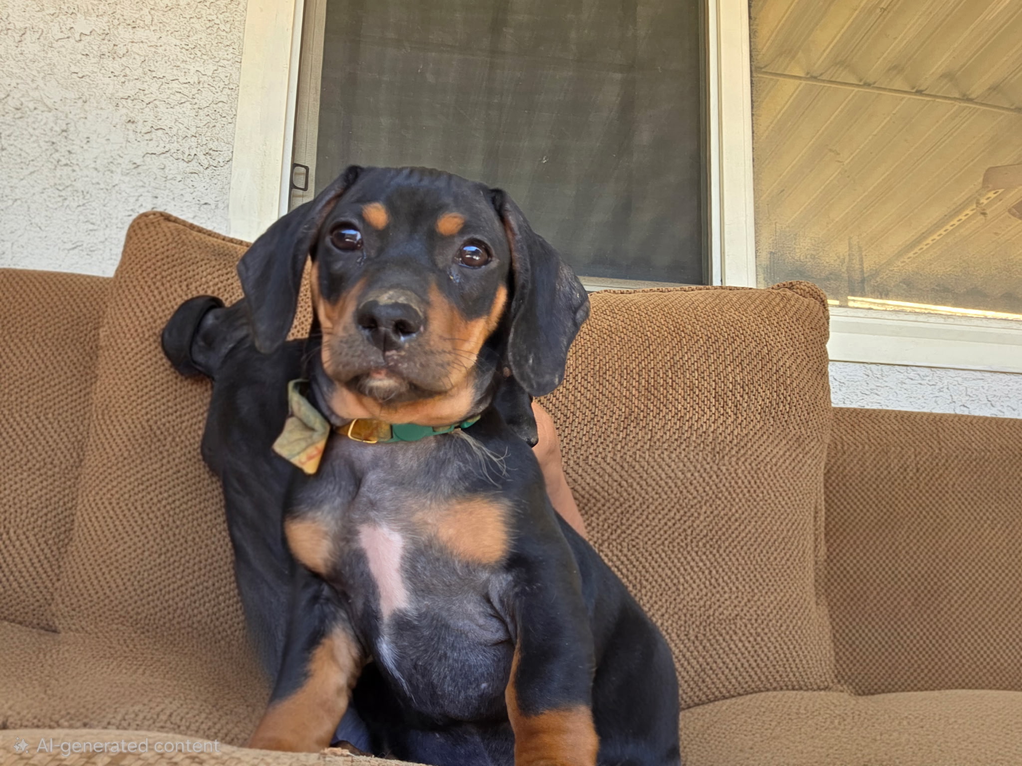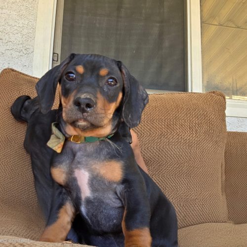 Shane is a 13 week old Dachshund, min-pin mix. Shane is the biggest of the brothers but is also the most shy. He likes to sit on his person's lap and observe the goings on around him. He would do best in a home with another confident dog t o show him the ropes. He is expected to be 20-25 pounds full grown.