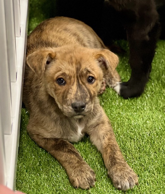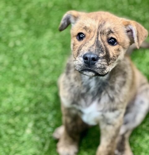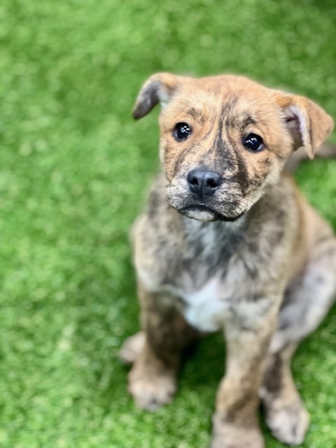 Vixen came to us as an orphaned pup at approximately 4 weeks old. She has been raised in a loving foster home and is super social and fun! We don't know just what breeds make up her uniquely cute look but with her brindle coloring, she is turning heads everywhere she goes. Vixen is estimated to be around 60 lbs when fully grown.